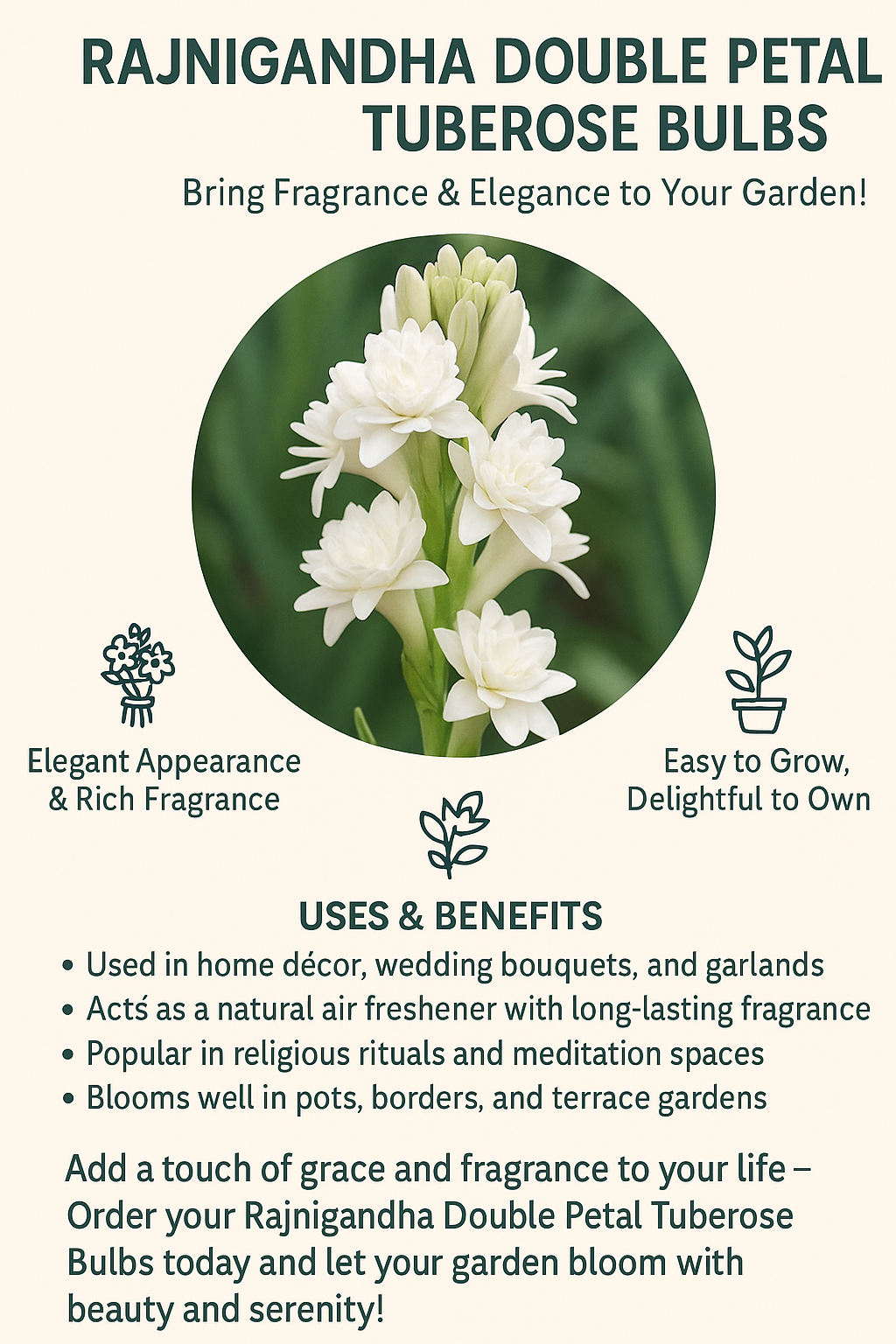 Transform your garden into a heavenly paradise with Rajnigandha Double Petal Tuberose Bulbs – nature’s own fragrant masterpiece! Known for their lush white double-layered petals and intoxicating scent, these tuberose bulbs are a favorite among garden lovers, floral decorators, and spiritual spaces.